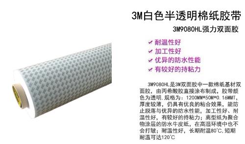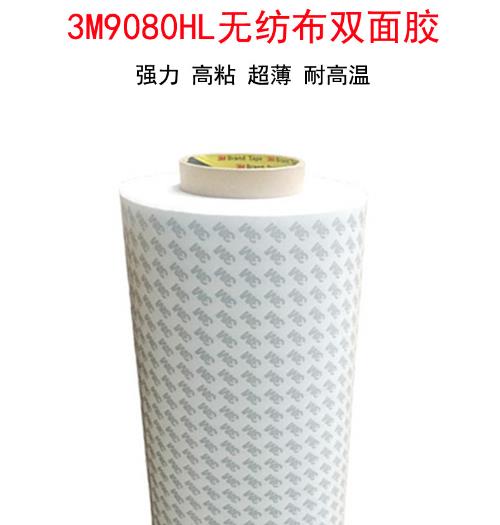 3M9080HL双面胶参数:宽度1200MM,长度50米 3M9080HL厚度0.16MM。 基材:无纺布 颜色:白色