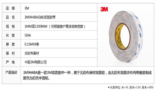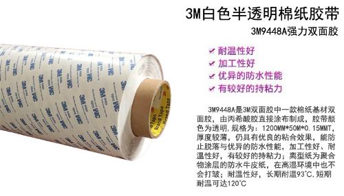 3M9448A双面胶参数:宽度1200MM,长度50米,3M9448A厚度0.15MM。基材:棉纸 颜色:白色。