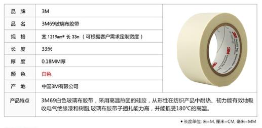 3M69# 规格:1219mmx33M 厚度:0.18mm 玻璃布胶带 颜色:白色
