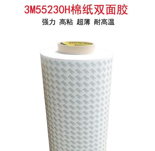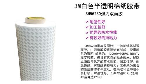 3M55230H双面胶带是3M棉纸基材双面胶中一款,颜色为白色半透明, 规格1200MM*50M,厚度0.15mm.3M55230H双面胶短期耐温性120℃, 长期耐温性80℃,是一款易于操作,通用的型的3M双面胶,具有强力无痕、高粘性、耐久性、耐高温的特点,易模切加工冲型。宽度可以在3mm-1200mm范围任意分切定制。