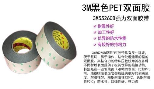 3M55260B黑色双面胶PET胶带,规格为:1200MMX50M,厚度0.2mm,颜色黑色。具强力高粘防水耐高温的特点。良好尺寸稳定性、定性,耐湿性、初粘性和持粘性好,易模切加工,耐温性好;能适用于更宽的温度范围和恶劣环境;长期耐温121℃,短期耐温可达149℃,3M55260B黑色双面胶PET胶带强力高粘黑色双面胶带。