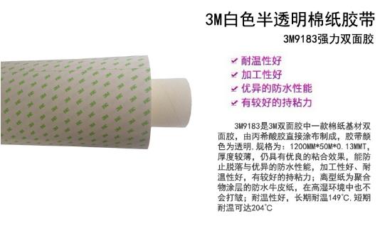3M9183T特点:厚度较薄,仍具有优良的粘合效果,能防止脱落与优异的防水性能,加工性好、耐温性好,有较好的持粘力;离型纸为聚合物涂层的防水牛皮纸,在高湿环境中也不会打皱;耐温性好,长期耐温149℃,短期耐温可达204℃。