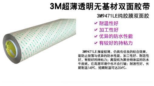 3M9471LE是3M双面胶中的一款无基材双面胶,属于VHB胶系(压敏胶系),厚度为0.05MM,颜色为透 明,具有超强的粘性,更具有超强的物理稳定性和化学稳定性,既可以隔绝潮湿气体、起到密封作用,还具有抗化学剂、抗紫外线直射,抗温度急剧变化等特征,可以用于取代螺钉、柳钉等传统固定方法,用双面胶带固定能使产品表面更为光滑、美观、操作更加简单、密封性更好、效果更为持久、拆装十分方便。