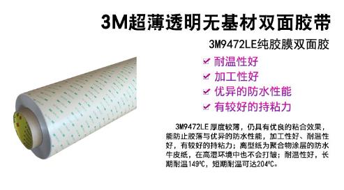 3M9472LE特点与应用: 纯胶膜产品对粗糙表面,曲面有较好的贴服性和粘接性,并且具有耐温,耐湿,耐溶剂等特点。