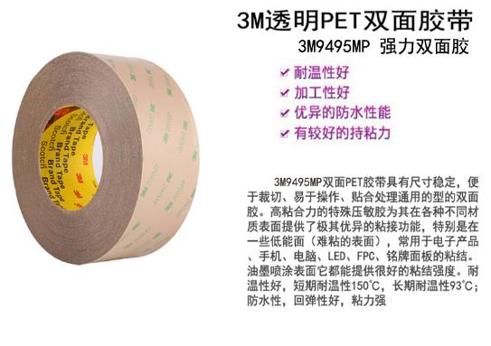 3M9495MP双面胶技术参数 规格:1372mmx55米,3M9495MP厚度:0.14MM。 基材:PET 颜色:透明
