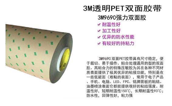 3M9690耐温性:长期耐温:90℃,短期耐温:149℃.3M9690是一款透明PET基材的高性能双面胶,3M9690针对一般塑胶及泡绵有极佳粘度,在高温和低温下都有几好的搞剪切性,优异的耐老化性,搞张力强,对于光滑表面OPP、PC、PS压克力等塑胶具有很好的永久性粘拉,用于手机配件、电脑配件、汽车配件、面板粘接。