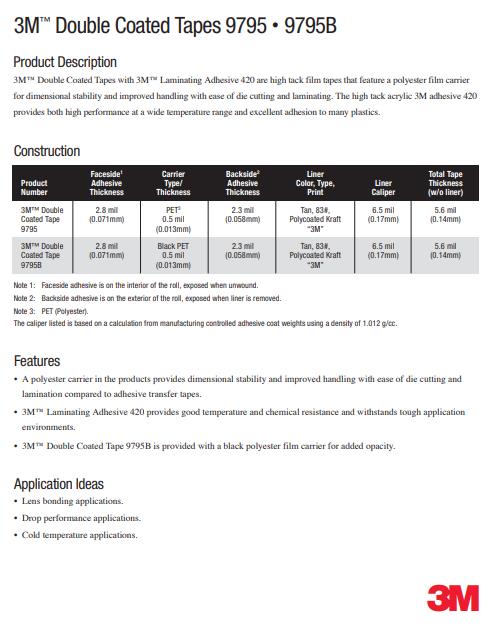 3M9795B特性:具有良好尺寸稳定性、热稳定性、化学稳定性,耐湿性、初粘性和持粘性好,易模切加工,耐温性好;能适用于更宽的温度范围和恶劣环境;离型纸为聚合物涂层防湿牛皮纸,在高湿度条件下也不会发生皱折。