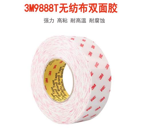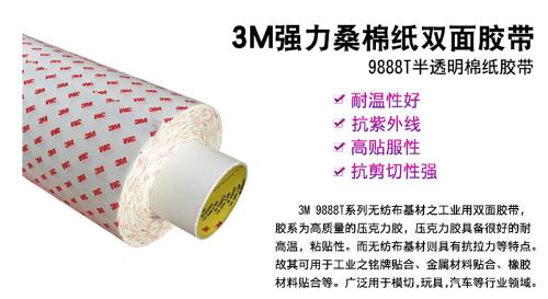 3M9888T双面胶耐温性好,短期耐温性150℃,长期耐温性120℃;防水性回弹性好,初粘性和持粘性好,尺寸稳定性好,离型纸为白色离型纸,带红色“3M”LOGO;易模切加工。
