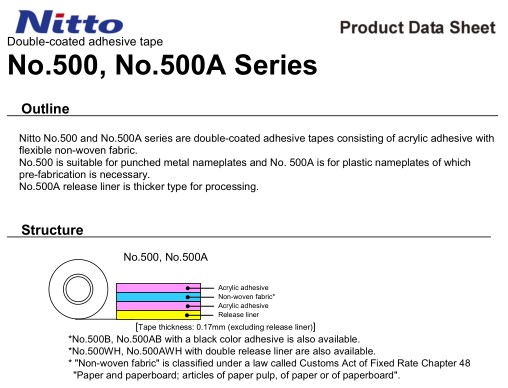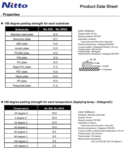 贮存期限: 在室温和50%相对湿度条件下,原包装状态下自生产之日起保存期为12个月。 产品应用: 日东500在环保方面符合ROHS环保法规要求,主要用于冲压金属铭牌、塑料标示牌的固定;粘贴汽车的登记表板及空调用装饰板;固定家用电器的零部件;用于橡胶脚垫的固定。