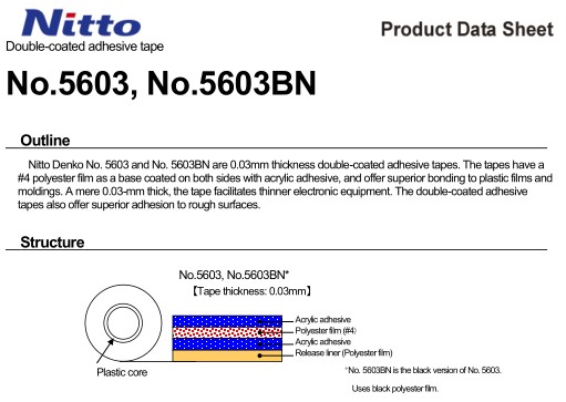 日东5603是薄膜双面胶带,其厚度仅为0.03mm。该超薄双面胶带可在有限空间固定各种薄型产品。0.03mm的薄度也为电子器件薄型化发展提供了有利条件。聚酯基材使该产品部仅具有较均匀的厚度而且在较薄厚度的基础上更易于模切冲型,使该产品具有较好的尺寸稳定性和可操作性。