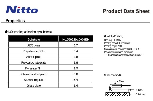 日东5603BN 规格: 500MMx100M 基材 PET 厚度 0.03(mm)固定宽度 500(mm) 颜色 黑色,适用范围 用于固定LCD和背光源模板四周的薄片。