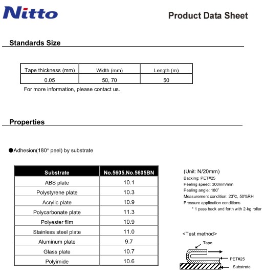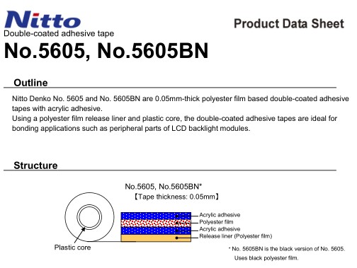 日东5605BN 规格: 500MMx100M 基材 PET 厚度 0.05(mm)固定宽度 500(mm) 颜色 黑色,适用范围 用于固定LCD和背光源模板四周的薄片。