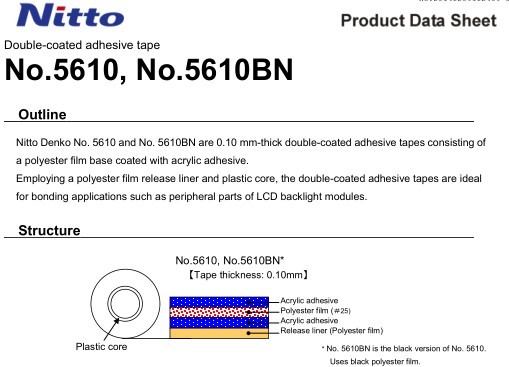 结构: 胶带厚度中不包括剥离层的厚度。 特性: 各粘附体180 ° 剥离粘合力 单位: N/20mm 粘附体粘合力 不锈钢板 8.3 ※在PET#25裱褙、23℃、拉伸速度为300mm/min的条件下做180 ° 剥离测试。 各温度下180 ° 剥离粘合力(对不锈钢) ※在PET#25衬里、拉伸速度300mm/min的条件下进行180°的剥离测量在上表各温度条件下,压接胶带并测量 日东5610用途: 用于固定手机等微型LCD用背光源中使用的反射板及薄膜材料。 用于固定电磁波吸收板。 用于固定微型电子机器内的薄膜材料。