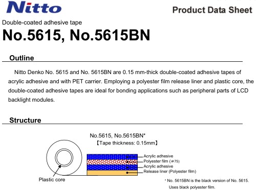 日东5615 规格;500mm*100m 厚度0.15(mm)颜色:透明 日东5615 由于基材是聚酯薄膜,所以胶带厚度均匀,具有优秀的加工性和作业性。 采用很少产生灰尘的聚酯薄膜制剥离层和塑料制卷筒芯,备有各种厚度的产品。