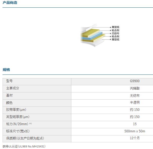 迪睿合DexerialsG9900属于无纺布基材双面胶,规格为: 1020MM*50M*0.15MM,颜色为半透明;对金属及塑料件具有良好的粘性,具有优良的耐热性;钢板剥离强度为15.7N/2CM,ABS剥离强度为15.5N/2CM;短期耐温性120℃,长期耐温性70℃;初粘性、持粘性好;易模切加工。 贮存期限: 在室温和50%相对湿度条件下,原包装状态下自生产之日起保存期为12个月。 产品应用: 汽车,家用电器,金属,机器设备,塑料,电路板,玻璃,陶瓷,包装等多种材料的架构粘结,如电子产品塑料部件的固定,夹层玻璃等等。