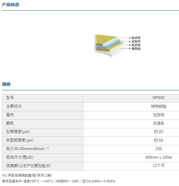 迪睿合DexerialsNP605 粘着力N/2CM:275N/4CM 剥离离型纸:纸(60U) 接着条件:NP605 温度100-140摄氏度,时间8-15秒,压力20-30N/CM2。 特性: 最适合于SUS,AL等的金属材料的粘接,丰富的厚度变化,也有微粘着力型的,可以临时固定,由于常温下无粘性,可进行剥掉离型纸的模切加工、折弯加工,90°C下可贴合的低温热塑性型。
