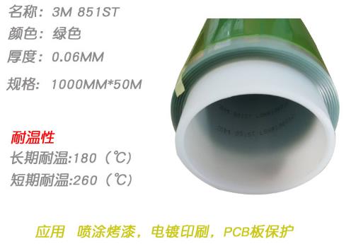 3M851ST特点与应用:粘性强,耐高温,耐腐蚀且不留残胶,主要应用于高温保护,电脑机壳机箱烤漆保护,遮蔽保护,线路板保护电镀喷涂,线路遮蔽,LED封装用等。