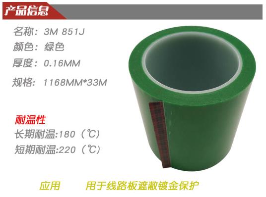 3M851J超洁净的胶层可降低污染容易撕除,不易断裂,撕除后不残胶,耐高温,耐酸碱溶液。3M851J适用范围线路板过波峰焊时保护,FCB镀金保护,电脑机壳、机箱、LED封装用等。