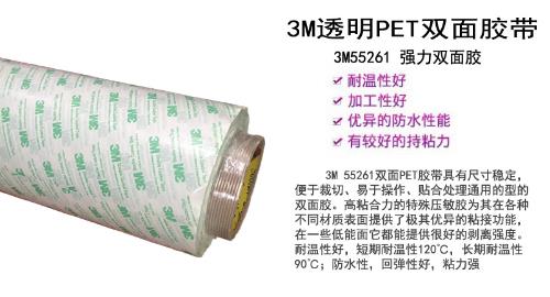 3M55261厚度仅为0.1MM超薄双面透明PET胶带,可应用于医用或者非医用诊断测试绷带的粘结,LCD泡棉粘结,话筒网孔和滤波器的粘结,LCD垫片粘结,手机附件的粘结,背光源组件如框体,反光片,遮光片,折射片等的粘结等。