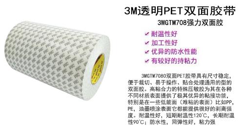 3MGTM708双面透明PET胶带,具有尺寸稳定,便于裁切、贴合处理的优点。高粘合力的特殊压敏胶为其在各种不同材质表面提供了极其优异的粘接功能,特别是在一些低能面(难粘的表面)比如PP,PE,油墨喷涂表面它都能提供很好的剥离强度。