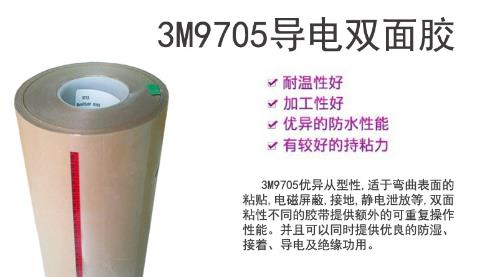 3M9705导电胶压感式丙烯酸,X轴异向导电胶带,可应用于软板之间接着EMI/RFT屏障的 导电性接合.适用温度,低温:-6.67℃,高温:71.1℃。 3M9705(XYZ轴全向导电胶带,厚度:0.08mm)导电薄膜,具有良好的机 械性能、导电性及环境稳定性等要求.在将EMI电磁屏障粘贴与电子元件上3M9705(XYZ轴导电薄膜)使用创新的导电纤维,以提供高粘性及较好的导电性质;在软性线路板上的连结上,3M9705(Z轴异向导电薄膜)让电流仅在垂直厚度方向中导通;在连结软性电路板到液晶面板、印刷电路板或者其他种类的软性电路板,使用3M-9705(Z轴异向导电薄膜)胶带,可减少成本、材料及无需焊接的特点.、分为Z-Axis及XYZ-Axis两大类,前者适用于柔性线路板与硬质线路板, ITO玻璃等连接导通;后者广泛适用于抗屏蔽应用,具有比金属更良好的导电性能及易于加工,操作。适用于柔性线路板与硬质线路板。