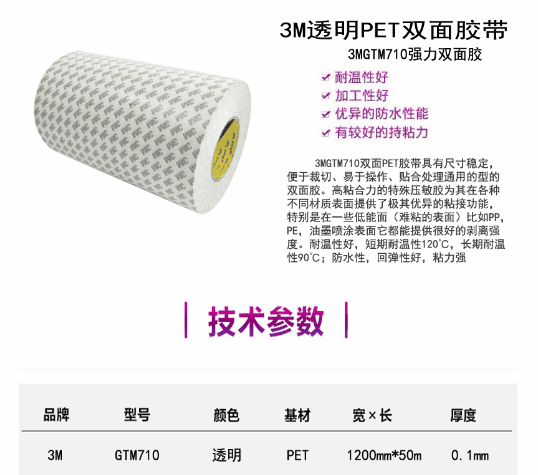 3MGTM710 规格:1200MMX50M 厚度:0.1mm 颜色:透明PET双面胶带。长期耐温121℃,短期耐温可达149℃ 特点:3MGTM710双面胶带由透明PET双面涂布丙希酸胶制成,厚度0.1mm具强力高粘防水耐高温的特点。尺寸稳定性、化学稳定性,耐湿性、初粘性和持粘性好,易模切加工,耐温性好; 能适用于更宽的温度范围和恶劣环境。